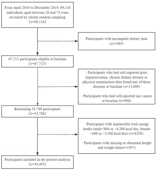 After the elimination of 1403 participants with insufficient reported dietary information, 13,009 participants with self-reported gout, hyperuricemia, or chronic kidney disease, or physical examination data that found any of these diseases at baseline, 996 participants with self-reported cancer of any type, 8258 subjects with ridiculous overall energy intake (for males < 800 or >4200 kcal/day, for females < 600 or >3500 kcal/day) [], and 1957 subjects with missing or abnormal height and weight, a total of 43,493 Shanghai-based individuals (15,727 male and 27,766 female) aged between 20 and 74 years were embraced within the scope of the present research (Figure 1). The research procedure was authorized by the Ethical Review Committee of the School of Public Health, Fudan University (IRB approval number 2016-04-0586). All subjects provided written informed approval prior to their participation.