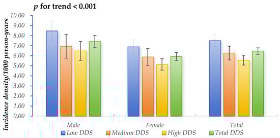 A total of 1460 newly developed hyperuricemia cases were ascertained throughout a median follow-up period of 5.59 years, encompassing 225,567.75 person-years as a whole. The overall incidence density was calculated at 6.47/1000 person-years (95% CIs: 6.14–6.80/1000 person-years), and the cumulative incidence rate was 3.4% (95% CIs: 3.2–3.5%). Individuals in the high-DDS group had the lowest incidence density of hyperuricemia, whereas those in the low-DDS group had the highest incidence density, as shown in Figure 2.