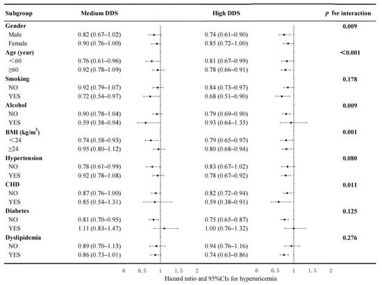 Figure 3 reveals the correlation among the DDS groups and hyperuricemia incidence in each subgroup with all covariates fully adjusted except for the covariate being analyzed. No significant interplay was discovered between DDS and smoking, diabetes, hypertension, and hyperlipidemia. However, a significant interplay was discovered between the DDS group and hyperuricemia in the subgroups of age, gender, alcohol consumption, BMI, and CHD. The correlation between the high-DDS group and hyperuricemia seemed to be stronger among the participants who were male, over 60 years old, reported no alcohol consumption, had a BMI ≥ 24 kg/m2, and had CHD at baseline compared with their counterparts.