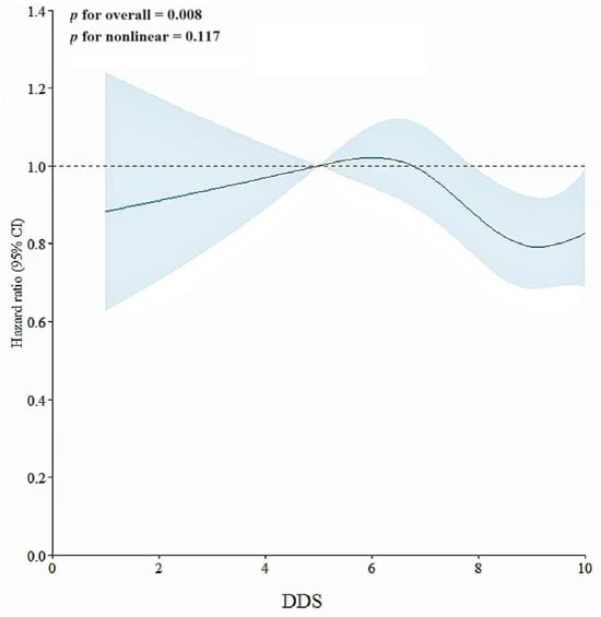 The RCS assessment revealed a linear correlation of DDS with hyperuricemia (p for linear tendency = 0.008, p for nonlinear tendency = 0.117; details are shown in Figure 4). The results remained consistent with the previous linear trend test. We further observed that an elevated DDS level was correlated with a decreased risk of hyperuricemia when DDS was above 7 points, which was consistent with the results achieved through Cox proportional hazards models.