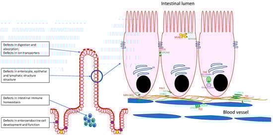 Congenital diarrhoeal disorders are genetically and phenotypically heterogeneous. In recent years, a useful classification of these disorders has been suggested, which provides a helpful framework within which to discuss this heterogeneous group []. These authors propose four groups of disorders: (i) defects in digestion and absorption of nutrients or of ionic transport, (ii) defects in enterocyte structure and function, (iii) defects in enteroendocrine cell differentiation and (iv) defects in intestinal immune homeostasis (see Figure 1).