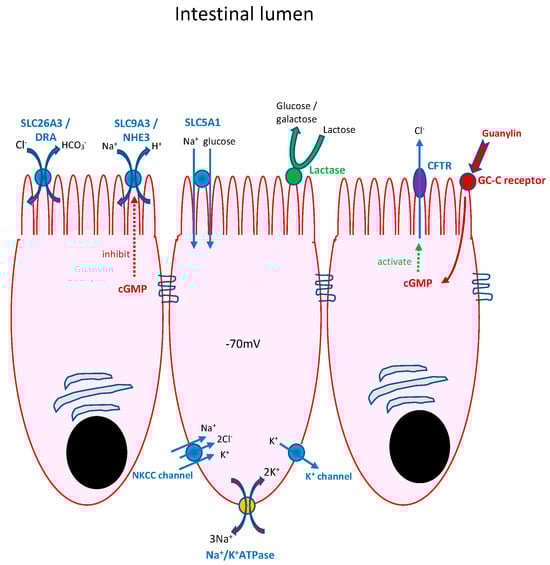A schematic representation of small bowel enterocytes depicting some of the apical and basolateral ion channels/pumps/enzymes discussed in the text above is shown in Figure 2.