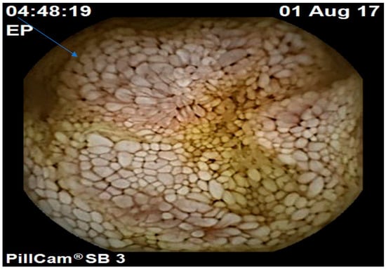 Capsule endoscopy image showing extensive intestinal lymphangiectasia (with permission).