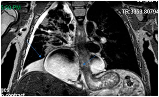 MRI chest showing right basal cystic lesion extending into medial left lung (with permission).