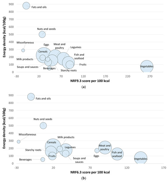 Nutrient-Rich Foods Index scores per 100 kcal. for each WAFCT food category plotted against energy density per 100 g. (a) NRF9.3; (b) NRF6.3 for priority micronutrients; (c) NRF15.3 extended priority nutrients. The size of the circles represents the number of foods in each food category.