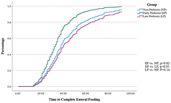 The time–percentage curve illustrates the progression of complete enteral feeding among three groups. The p-values were adjusted for birth body weight (BBW), exclusive human milk (eHM) feeding, ligation for hemodynamically significant patent ductus arteriosus (HsPDA), and 1 min Apgar score.