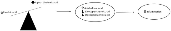 Effect of dietary increase in the ratio of linoleic acid and alpha-linoleic acid on inflammation. Arrow pointing up means an increased amount, while the arrow pointing down means a decreased amount.