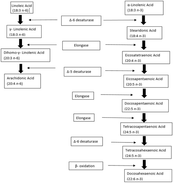 Metabolism of linoleic acid (LA) and α-linolenic acid (ALA) to a series of longer-chain unsaturated fatty acids, through enzymatic action. ∆-6 desaturase, Elongase, and ∆-5 desaturase are the common enzymes in the metabolism of LA and ALA. Arachidonic acid is produced from LA and Docosahexaenoic acid from ALA. Adapted from [73].