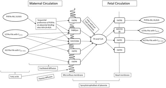 The transfer of FA across the placenta during pregnancy from mother to fetus requires FA carriers/transporters [100]. Lipid uptake requires the release of esterified FA within maternal lipoproteins [101]. Free FAs are more readily taken up by the placenta [102], which are transported from the mother to fetus through FA transport proteins (FATPs), fatty acid translocase (FAT), and intracellular FA binding proteins (FABPs) present in the placenta [98] (Figure 3). It has been observed that the binding of maternal FA with FATPs, present on the microvillus membrane of syncytiotrophoblast, are endocytosed and transported to the basolateral FATPs [103].