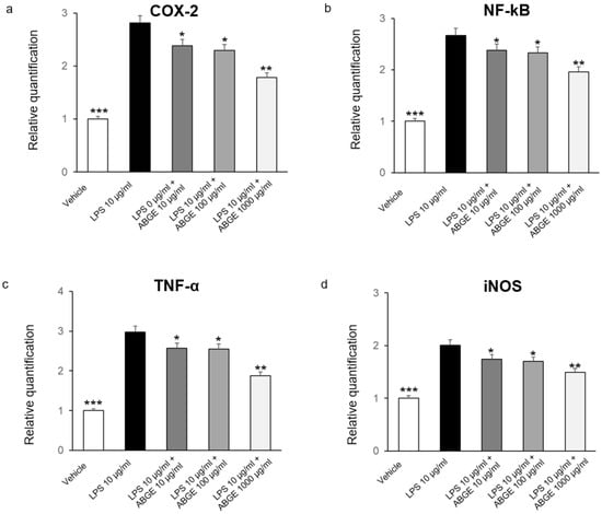 Effects of aged black garlic water extract (ABGE) (10–1000 μg/mL) on LPS-induced cyclooxygenase (COX)-2 (a), nuclear factor kappa (NF-κ) B (b), tumor necrosis factor (TNF)-α (c), and interleukin (IL)-6 (d) gene expression (RQ, relative quantification) in mouse prostate specimens. Data shown are means ± SEM of two independent experiments with triplicate determinations. ANOVA, * p < 0.05, ** p < 0.005; and *** p < 0.001 vs. LPS.