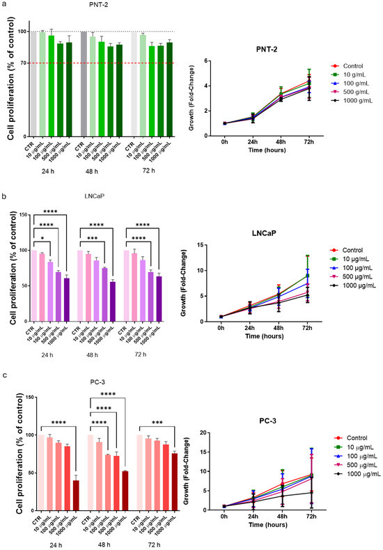 Similarly, the PC-3 cell line showed a significant reduction in cell proliferation following the treatment with ABGE (10–1000 µg/mL) compared to that of the control, with a greater decrease at higher concentrations (Figure 2c), thus confirming its antiproliferative activity also against androgen-independent cancer cells. After 48 h, we showed a significant decrease in cell proliferation starting from 100 µg/mL.
