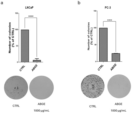 A clonogenic assay was performed on the LNCaP and PC-3 PCa cells treated with 1000 µg/mL of ABGE and incubated for 10 days. The results were expressed as a percentage of the number of colonies relative to the control [34] (Supplementary Materials Section).