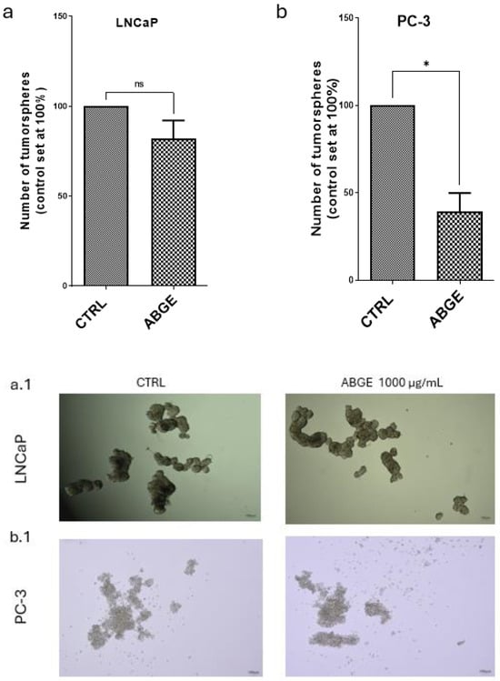 Effects of aged black garlic water extract (ABGE) on tumor spheroid formation of LNCaP (a,a.1) and PC-3 (b,b.1) cell line with ABGE at 1000 µg/mL or vehicle. Data shown are means ± SEM of 3 independent experiments with 3 replicates of each condition. ANOVA, * p < 0.05 vs. vehicle.