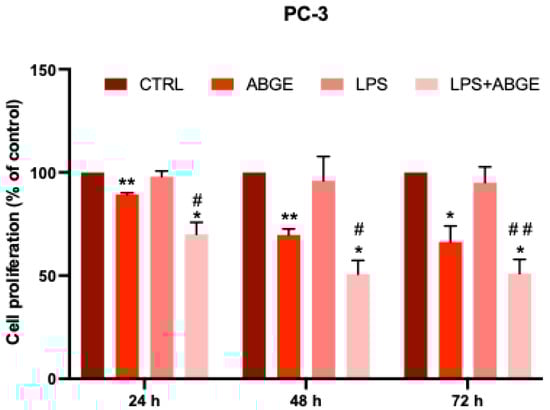 Effects of aged black garlic water extract (ABGE) in combination to LPS on cell proliferation of androgen-independent PC-3 cells. Cell proliferation was evaluated by resazurin reagent after incubation for 24, 48, and 72 h of PC-3 cell line with ABGE at 1000 µg/mL or vehicle. Data shown are means ± SEM of 3 independent experiments with 3 replicates of each condition. ANOVA, * p < 0.05, ** p < 0.005 vs. vehicle. ANOVA, # p < 0.05, ## p < 0.005 vs. ABGE.