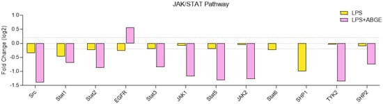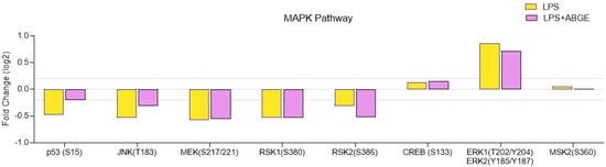The MAPK signaling pathway in the phosphoprotein array in response to 24 h treatment of 1000 µg/mL ABGE. The log2 Fold Change in the phosphorylation protein level in comparison with that for the control condition (threshold: log2 Fold Change = 0.2).