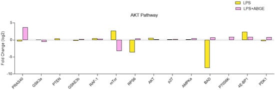 The AKT signaling pathway in the phosphoprotein array in response to 24 h treatment of 1000 µg/mL ABGE. The log2 Fold Change in the phosphorylation protein level in comparison with that for the control condition (threshold: log2 Fold Change = 0.2).