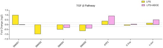 The TGF-β pathway in the phosphoprotein array in response to 24 h treatment of 1000 µg/mL ABGE. The log2 Fold Change in the phosphorylation protein level in comparison with that for the control condition (threshold: log2 Fold Change = 0.2).
