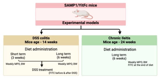Overview of the Experimental Design (SAMP1/YitFc, a sub-strain of AKR/J mice produced through a program of selective breeding; DSS, Dextran Sulfate Sodium; MPO, myeloperoxidase; FITC, fluorescein isothiocyanate).