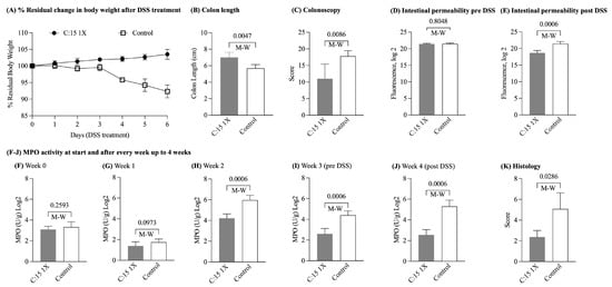 Based on the findings from this pilot study, we then repeated the experiment, increasing the N and focusing on the 1X dose (vs. control, n = 7/group). Significant alleviation of colitis symptoms was again observed in the mice treated with C:15 as compared to the control group (Figure 2). Compared to the control group, C:15 aided in maintaining the body weight of mice after DSS treatment (% Residual weight on the day of sacrifice; C:15(1X) 103.1 ± 2.0 vs. control: 92.0 ± 2.8, t-test p = 0.005; Figure 2A). The mice treated with C:15 had significantly longer colons (average colon length; C:15: 7.0 ± 0.6 vs. control: 5.6 ± 0.4, p < 0.0047; Figure 2B) and lower colonoscopy scores (mean scores; C:15: 3.1 ± 1.0 vs. control: 4.4 ± 1.5, p < 0.008; Figure 2C) compared to the control mice. Additionally, the FITC-dextran assay revealed the potential for C:15 to maintain intestinal integrity, evident by lower plasma fluorescence in the C:15 treated groups post-DSS treatment compared to the control mice (FITC Dextran Log2; C:15 18.6 ± 0.7, control: 21.4 ± 0.6, p < 0.001; Figure 2D,E). Further, C:15 exhibited anti-inflammatory properties, with treated mice exhibiting lower fecal MPO activity compared to the control group, both before and after DSS treatment (Figure 2F–J). The alleviation of colitis symptoms in the C:15 treated mice was also confirmed by lower colon histology scores (C:15: 11.0 ± 4.3 vs. control: 17.8 ± 1.6, p < 0.02) compared to control mice (Figure 2K). We then tested whether increasing the duration of C:15 supplementation would have a beneficial effect on DSS colitis.