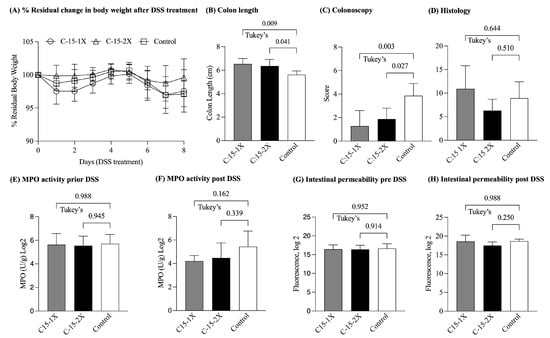 To determine if the consumption of C:15 for longer than 3 weeks could prevent or attenuate the occurrence of colitis of DSS-induced colitis, 14-week-old SPF-SAMP mice were randomly assigned to one of three groups to receive C:15 at 1X (26 µg/mouse/day) or 2X (52 µg/mouse/day) dosages or the control vehicle for a six-week period prior to the exposure of mice to DSS in the drinking water (Figure 3). The 6 wk supplementation, however, did not have a significant effect on body weight, fecal MPO, or intestinal permeability. C:15 demonstrated a positive impact on maintaining mouse body weight. However, there was not a significant difference between the groups (% residual weight on the day of sacrifice; C:15(1X): 97.5 ± 2.9, C:15(2X): 99.5 ± 2.5 vs. control: 97.1 ± 1.7, ANOVA, p = 0.2; Figure 3A). At the end of the 6 wk feeding trial, DSS-treated SAMP mice given C:15 exhibited greater colon lengths (average; C:15(1X): 6.5 ± 0.4, C:15(2X): 6.3 ± 0.5 vs. control: 5.6 ± 0.3, ANOVA, p = 0.008; Figure 3B) and lower post-DSS colonoscopy scores (mean scores; C:15(1X): 1.6 ± 0.8, C:15(2X): 1.6 ± 0.8 vs. control: 4.7 ± 0.9, ANOVA, p = 0.003; Figure 3C) compared to the control group. However, there was no significant difference in the colon histology scores between the C:15-treated and control groups (mean scores; C:15(1X): 10.9 ± 4.8, C:15(2X): 6.3 ± 2.3 vs. control: 8.9 ± 3.4, ANOVA, p = 0.1; Figure 3D). Additionally, there was no significant difference in the fecal MPO activity among various groups, indicating that long-term treatment of C:15 did not effectively reduce inflammation (fecal MPO activity Log2; C:15(1X): 3.1 ± 0.2, C:15(2X): 3.2 ± 0.9 vs. control: 7.1 ± 0.1, ANOVA, p = 0.1) (Figure 3E,F). Furthermore, based on the FITC-dextran assay results, it appeared that prolonged administration of C:15 did not protect against DSS-induced increased gut permeability (FITC dextran Log2; C:15(1X): 19.0 ± 2.1, C:15(2X): 17.6 ± 0.5 vs. control: 24.0 ± 0.5, ANOVA, p = 0.1) (Figure 3G,H). Overall, the findings suggest that the anti-inflammatory potential of the C:15 diet could be achieved within 3 weeks.