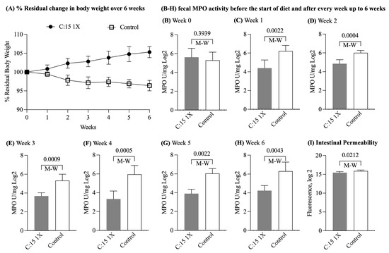 Treatment of older SPF-SAMP mice with C:15 for six weeks reduces the severity of established ileitis. Values are mean ± SD, n = 6. (A) Effect of C:15 diet on body weight over six weeks (percentage change from original body weight defined as week 0 and as 100% after the start of diet). (B) Fecal MPO activity before the start of diet. (C) Fecal MPO activity after 1 week, (D) 2 weeks, (E) 3 weeks, (F) 4 weeks, (G) 5 weeks, and (H) 6 weeks of diet administration. (I) Intestinal permeability assay—FITC-Dextran before sacrifice (FITC, fluorescein isothiocyanate; MPO, myeloperoxidase; M-W, Mann–Whitney U test).