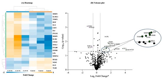 An immune exhaustion panel (XT Mm Exhaustion CSO, Nanostring, Seattle, WA, USA) was used to analyze the gene expression that targets ~785 genes associated with different immunological pathways. The data were analyzed using the online platform ROSALIND (https://nanostring.rosalind.bio, accessed on 24 July 2024), and heatmaps and volcano plots (Figure 5) were generated to visualize the clustering of genes that exhibited differential expression between the experimental groups. The genes were clustered according to the ‘partitioning around medoids’ algorithm and ‘Flexible Procedures for Clustering’ R library and multiple database sources, including BioPlanet, REACTOME, WikiPathways, and NCBI. The heatmap and volcano plot revealed that the mice treated with DSS after C:15 supplementation for three weeks had altered gene expression in comparison with the control mice (Figure 5A,B). The heatmap shows that the expression of 20 genes was significantly altered, out of which 16 were upregulated, and 4 genes were downregulated. The altered genes of interest were involved in different immune pathways related to cytokines and inflammatory response (IL1, IL6, IL11, IL15, IL1R1, IL1RL1, and CSF3), matrix metalloproteinases (MMP3, MMP9, MMP14, and TIMP1), and collagen and extracellular matrix degradation (MMP3, MMP9, and MMP14).