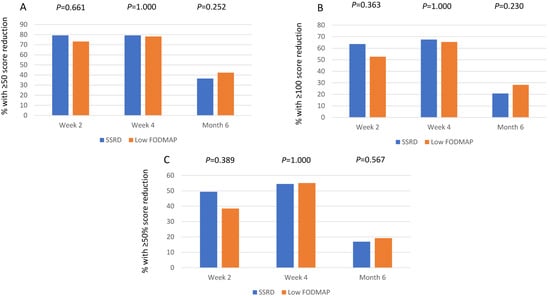 Responder rates given in percentage and calculated as intention-to-treat with (A) ≥50 decrease of total IBS-SSS score, (B) ≥100 decrease of total IBS-SSS score, and (C) ≥50% decrease of total IBS-SSS score. SSRD = starch- and sucrose-reduced diet with 72 patients at week 2 and 4 and 53 at month 6, out of 77. Low FODMAP = low content of fermentable oligo-, di-, and monosaccharides and polyols with 72 patients at week 2 and 4 and 49 at month 6. Fisher’s exact test. p ≤ 0.05 was considered statistically significant.