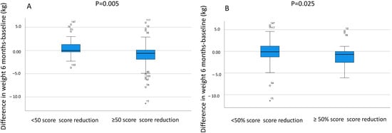 Calculations per protocol showed similar results (Supplementary Figure S2). There were fewer responders in those with a vegetarian diet when considering >100 points and 50% reduction of total IBS-SSS (p = 0.016 and p = 0.018, respectively). When calculating all who had any diet such as gluten-reduced, lactose-free, or vegetarians, the 50% responder rate was lower compared with those without any dietary restrictions (p = 0.031). Responders had slightly higher total IBS-SSS at baseline compared with non-responders both considering week 2 (316 (240–352) vs. 255 (235–340); p = 0.274), week 4 (316 (240–352) vs. 262 (222–356); p = 0.428), and month 6 (322 (258–366) vs. 282 (228–345); p = 0.116). Those who were responders (∆Total IBS-SSS ≥−50) at 6 months in the SSRD group, were those who still had lowered weight (−0.7 (−2.5–0.1) vs. 0.2 (−0.7–2.2) kg; p = 0.005) and BMI (−0.25 (−0.85–0.03) vs. 0.07 (−0.35–0.77) kg/m2; p = 0.009) compared with baseline (Figure 2A). Similar results were found of 50% decrease regarding BMI (p = 0.027) and weight (Figure 2B).