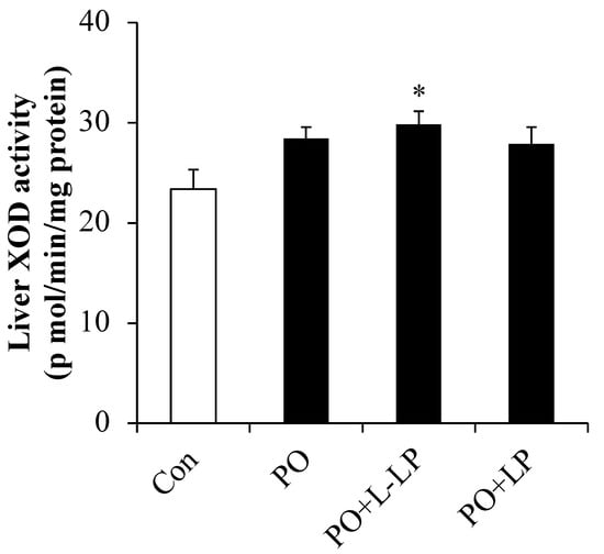 XOD (xanthine oxidase) activity in the liver is presented in Figure 2. XOD activity was significantly higher in the PO + L-LP group than that in the control group.