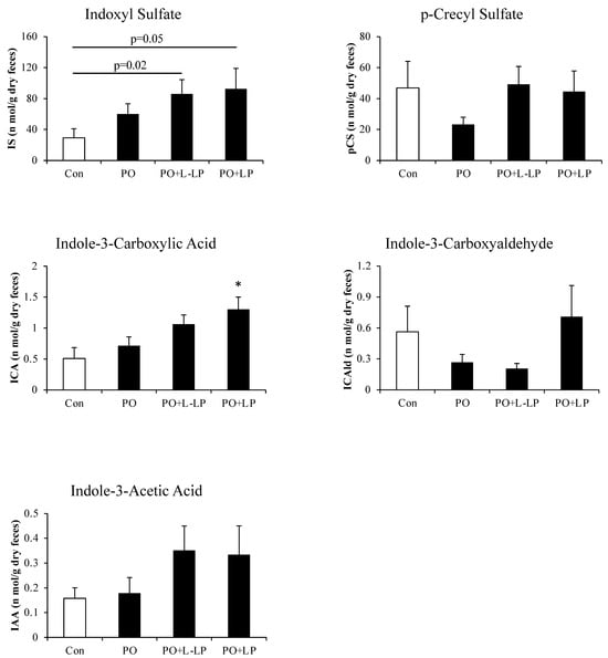 Fecal excretion of Indole-3-Carboxylic Acid was significantly higher in the PO + LP group than in the Con group. There were no significant differences in the fecal excretion of IS, but excretion increased in the PO group compared with that in the Con group and tended to increase in a concentration-dependent manner with LP06CC2 administration. Con vs. PO + LP (p = 0.05), Con vs. PO + L-LP (p = 0.02).