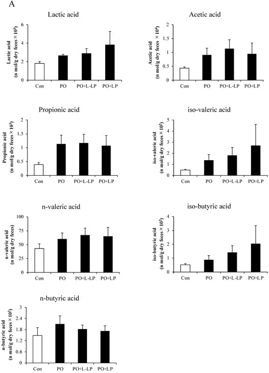 Figure 1 shows UA levels in the plasma, urine, and feces. There were no significant differences in the plasma and urinary UA levels among the dietary groups, whereas the fecal UA levels were significantly higher in the PO + LP group than in the control group.