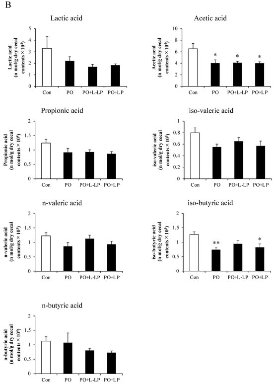 Short-chain fatty acids. Effect of Lactiplantibacillus plantarum 06CC2 on short-chain fatty acids (SCFAs) in fecal excretion (A) and cecal content (B). Data are the means ± SE, n = 8, ** p < 0.01, * p < 0.05 vs. PO for the Tukey–Kramer test. Con: control diet, PO: potassium oxonate diet, PO + LP: potassium oxonate, 0.1% LP06CC2 diet, PO + L-LP: potassium oxonate, and 0.02% (low) LP06CC2 diet, SE: standard error.
