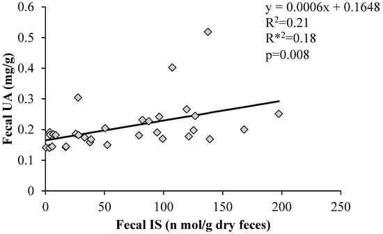 Correlation between fecal uric acid levels and fecal indoxyl sulphate. Graph of the correlation coefficients between fecal uric acid and fecal indoxyl sulfate levels using Statcel 4. R2: coefficient of determination; R*2: degrees of freedom adjusted coefficient of determination; p: p-value, UA: uric acid, IS: indoxyl sulfate.