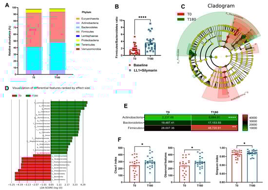 (A) Gut microbiota profile abundance in phyla. (B) Firmicutes/Bacteroidetes ratio. (C) Cladogram from LEfSe pre- and post-supplementation. (D) The logarithmic linear discriminant analysis (LDA) effect size (LEfSe) scores pre- and post-supplementation. (E) Heatmap of the modulated phyla. (F) Alpha (α) diversity indices of Chao1, Observed features, and Simpson index. Values are expressed as the percent of relative abundance (mean ± standard deviation). * p < 0.05. ** p < 0.01, **** p < 0.0001.