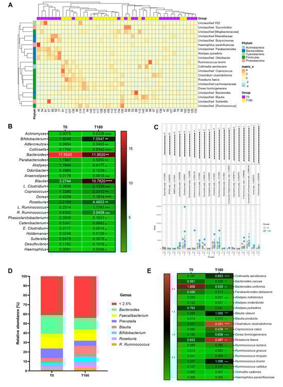 The genera profile shows that supplementation improves diversity and the abundance of Blautia genera (Figure 3D). The heatmap helps to enhance the visualization of genus clusters with similar trends in expression, highlighting the increase in genera Sutterella, Blautia, and Roseburia in T180 (Figure 3A). In the genus, the post-supplementation reduced the abundance of Bacteroides, Sutterella, Alistipes, and Odoribacter while increasing the abundance of Bifidobacterium, Collinsella, Blautia, Dorea, Roseburia, R. Ruminococcus and E. Clostridium (Figure 3B). Differential expression analysis applied to the genus highlights the increase in the Roseburia, Clostridium, Ruminococcus, Lachnospiraceae, Dorea, and Collinsella genera post-supplementation (Figure 3C). The species abundance post-supplementation increased Collinsella aerofaciens, Blautia obeum, Dorea formicigenerans, Clostridium clostridiforme, Roseburia faecis, and Ruminococcus bromii, among others, alongside a reduction in Bacteroide caccae, Alistipes indistinctus, and other Alistipes species (Figure 3E).