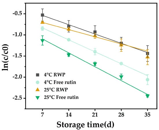 The study of degradation kinetics is important for predicting the stability of bioactives during storage and processing [38]. Figure 2 shows the degradation curves of free and encapsulated rutin stored at 4 °C and 25 °C for 35 days, respectively, and all the curves showed good linear correlation coefficients (R2 > 0.97). This indicated that the model fitted the degradation kinetics well [39].