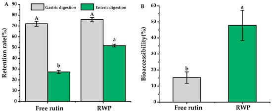 It has been reported that some flavonoids, represented by rutin, are susceptible to isomerization and protonation under acidic conditions, leading to degradation and reduced bioavailability [43]. Therefore, the gastrointestinal digestive stability of rutin was investigated in this study. As the results in Figure 3 show, after gastric and enteric digestion, the retention rate of free rutin was 27.45 ± 1.45%, while the retention rate of encapsulated rutin was over 50%, which showed significant difference (p < 0.05). Additionally, the bioaccessibility of rutin in RWP was 47.84 ± 9.43%, which was about three times higher than that of the free rutin (p < 0.05).