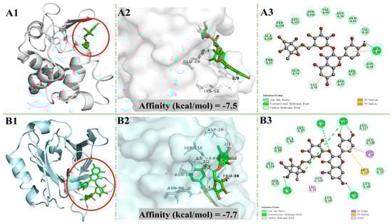 Molecular docking results. (A) α-LA + rutin. (B) β-LG + rutin. α-LA: α-lactalbumin; β-LG: β-lactoglobulin; panel labels 1, 2, and 3 represent the 3D binding site map, 3D hydrogen bonding map, and 2D interaction map, respectively.