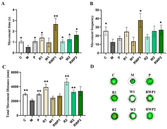 Movement performance of zebrafish. (A) High-speed movement time. (B) High-speed movement frequency. (C) Total movement distance. (D) Trace map of the movement. A moving speed lower than 4 mm/s is marked in green; 4–20 mm/s is marked in black; and higher than 20 mm/s is marked in red. C, the control group; M, the model group; P, the positive control group; R1 and R2, the rutin treatments at 25.0 ng/fish and 50.0 ng/fish, respectively; W1 and W2, the whey protein treatments at 200.0 ng/fish and 400.0 ng/fish, respectively; RWP1 and RWP2, the rutin–whey protein Pickering emulsion treatments at 25% and 50% of the initial concentration, respectively. Data are expressed as mean ± SE (n = 10). The result of each group was compared with the M group, * indicates p < 0.05 and ** indicates p < 0.01.