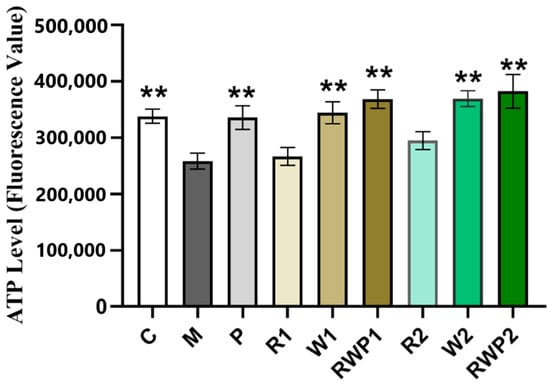 ATP levels in different groups. C, the control group; M, the model group; P, the positive control group; R1 and R2, the rutin treatments at 25.0 ng/fish and 50.0 ng/fish, respectively; W1 and W2, the whey protein treatments at 200.0 ng/fish and 400.0 ng/fish, respectively; RWP1 and RWP2, the rutin–whey protein Pickering emulsion treatments at 25% and 50% of the initial concentration, respectively. Data are expressed as mean ± SE (n = 10). The result of each group is compared with the M group, * indicates p < 0.05 and ** indicates p < 0.01.