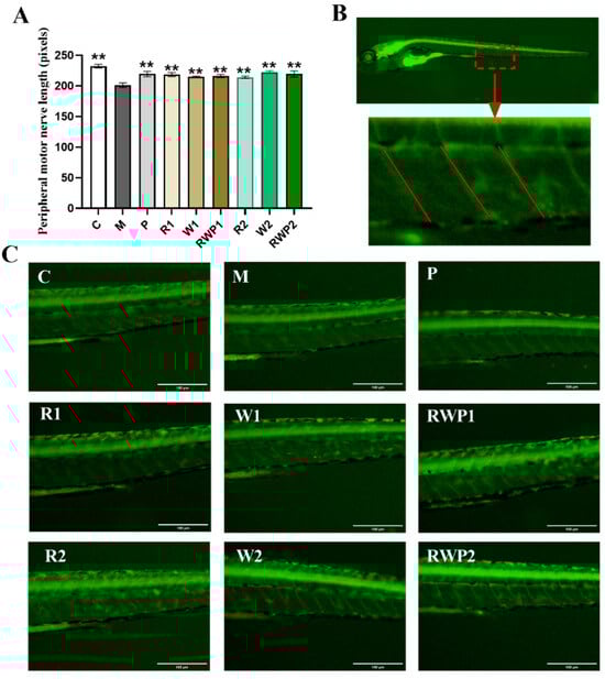 The peripheral motor nerve length measurement results and images (120×). (A) Peripheral motor nerve length. (B) Schematic representation of the peripheral motor nerve length analysis region. (C) Peripheral motor nerve length measurement areas of each treatment. C, the control group; M, the model group; P, the positive control group; R1 and R2, the rutin treatments at 25.0 ng/fish and 50.0 ng/fish, respectively; W1 and W2, the whey protein treatments at 200.0 ng/fish and 400.0 ng/fish, respectively; RWP1 and RWP2, the rutin–whey protein Pickering emulsion treatments at 25% and 50% of the initial concentration, respectively. Data are expressed as mean ± SE (n = 10). The result of each group was compared with the M group, * indicates p < 0.05 and ** indicates p < 0.01.