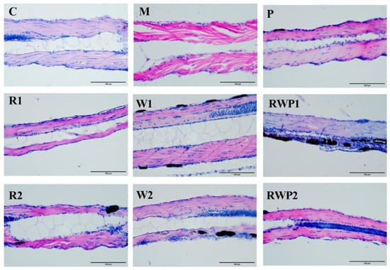 Aging is accompanied by damage to skeletal muscle structure, which is also one of the typical symptoms of sarcopenia [63]. In the histopathological analysis (Figure 8), the muscle tissue of the C group zebrafish exhibited a typical organization, with muscle cells being slender and elongated, showing a fibrous appearance, and tightly arranged. In contrast, the muscle tissue of the M group was loosely structured and the myocytes were irregularly arranged, indicating the compromised muscle structure. The zebrafish muscle tissue lesions of the R, W, and RWP groups at various doses showed a normalization tendency when compared to the M group. The arrangement of myocytes in these groups was more regular and tighter than those of the M group, indicating the protective effect on skeletal muscle structure.