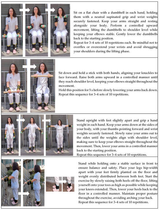 The Template for Intervention Description and Replication (TIDieR) checklist describes the exercise-based intervention [33]. The training protocol (Figure 1) consisted of a combination of muscle resistance and balance exercises supervised by a physical therapist (36 one-hour sessions, i.e., 3 sessions per week for 12 weeks). Muscle resistance exercises of the upper and lower limbs (shoulder flexor and abductor, elbow flexor, hip flexor and abductor, knee flexor and extensor and plantiflexor muscles) were performed according to the principles of periodization and progression [6]. Training started with 0.5 kg on each limb and increased every two weeks by 0.5 kg, according to the participant’s tolerance (see Figure 2). Each session began with a 5 min warm-up followed by 30 min of resistance training (10 min, upper limbs; 20 min, lower limbs), 10 min of balance exercises, and a 5 min cool-down. After each exercise session, patients received 3 g/day of HMB for 12 weeks (84 packets, a total dose of 252 g) and were instructed to consume a daily dose at the same time on non-training days during the 12 weeks.