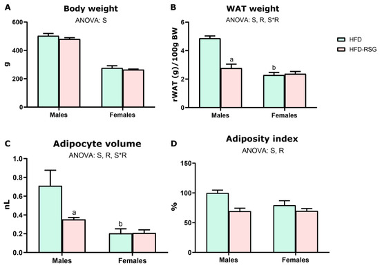 RSG and sex effects on body weight and adiposity. (A) Body weight. (B) White adipose tissue (WAT) weight refers to 100 g of body weight. (C) Adipocyte volume. (D) Adiposity index calculated as the sum of gonadal, retroperitoneal, and mesenteric depot weights relative to 100 g of body weight. Values are presented as the mean ± SEM (5–9 animals per group). Sex and RSG effects were analyzed by two-way ANOVA (p < 0.05): S—sex effect; R—RSG effect; and S*R—interactive effect. Fisher’s LSD post-hoc test (p < 0.05): (a) vs. HFD rats; (b) vs. male rats. WAT—white adipose tissue.
