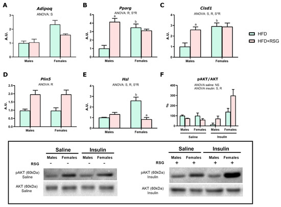Insulin sensitivity and lipid mobilization in WAT. Gene expression analysis of (A) Adipoq, adiponectin; (B) Pparg—peroxisome proliferator-activated receptor gamma; (C) Cisd1—mitoNEET; (D) Plin5—perilipin 5; and (E) Hsl—lipase, hormone-sensitive. (F) pAKT/AKT ratio analyzed by Western blot. AKT serine-threonine kinase activation: insulin-treated animals received an intraperitoneal injection of insulin (5 U/kg) 20 min before sacrifice, while untreated animals (saline group) were injected with 0.9% sodium chloride solution (w/v). Values are presented as the mean ± SEM (4–7 animals per group). Sex and RSG effects were analyzed by two-way ANOVA (p < 0.05): S—sex effect; R—RSG effect; and S*R—interactive effect. Fisher’s LSD post-hoc test (p < 0.05): (a) vs. HFD rats; (b) vs. male rats.