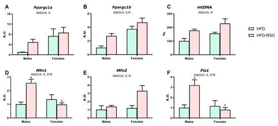 Mitochondrial biogenesis and dynamics in WAT. Gene expression analysis of (A) Ppargc1a—peroxisome proliferator-activated receptor gamma coactivator 1-alpha; (B) Ppargc1b—peroxisome proliferator-activated receptor gamma coactivator 1-beta; (C) mtDNA—mitochondrial DNA; (D) Mfn1—mitofusin 1; (E) Mfn2—mitofusin 2; (F) Fis1—fission, mitochondrial 1. Values are presented as the mean ± SEM (4–7 animals per group). Sex and RSG effects were analyzed by two-way ANOVA (p < 0.05): S—sex effect; R—RSG effect; and S*R—interactive effect. Fisher’s LSD post-hoc test (p < 0.05): (a) vs. HFD rats; (b) vs. male rats.