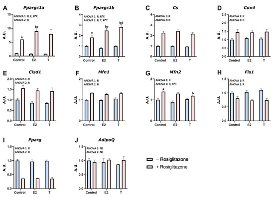 Considering the sex-dependent response of WAT to RSG, we aimed to investigate whether the sex hormones E2 and T, in combination with RSG, affected 3T3-L1 adipocyte mitochondrial biogenesis. As shown in Figure 5A–J, the expression of the target genes analyzed did not show significant differences when treated with E2 or T alone. However, the combined treatment of RSG and E2 had an additive effect in two target genes, significantly upregulating Ppargc1a and Ppargc1b (Figure 5A,B) compared to RSG alone. Similarly, the combination of RSG and T enhanced the expression of Ppargc1b and decreased Mfn2 expression.