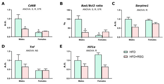 Markers of inflammation, hypoxia and apoptosis in WAT. Gene expression analysis of (A) Cd68 antigen; (B) Bad/Bcl2—BCL2 associated agonist of cell death/BCL2 apoptosis regulator. (C) Serpine1, PAI-1—plasminogen activator inhibitor-1; (D) Tnf—tumor necrosis factor alpha; and (E) Hif1a—hypoxia inducible factor 1 alpha. Values are presented as the mean ± SEM (4–6 animals per group). Sex and RSG effects were analyzed by two-way ANOVA (p < 0.05): S—sex effect; R—RSG effect; and S*R—interactive effect. Fisher’s LSD post-hoc test (p < 0.05): (a) vs. HFD rats; (b) vs. male rats.