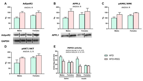 Markers of insulin sensitivity in the liver. Western blot analysis of (A) AdipoR2—adiponectin receptor 2; (B) APPL1—adaptor protein, phosphotyrosine interacting with PH domain and leucine zipper 1; (C) pAMPK/AMPK—phospho- and total protein kinase AMP-Activated Catalytic Subunit Alpha 1; (D) pAKT/AKT—pAKT/AKT, phospho- and total AKT serine-threonine kinase; and (E) PEPCK activity—phosphoenolpyruvate carboxykinase. To measure this enzymatic activity, insulin-treated animals received an intraperitoneal injection of insulin (5 U/kg) 20 min before sacrifice, while untreated animals (saline group) were injected with 0.9% sodium chloride solution (w/v). Values are presented as the mean ± SEM (5–7 animals per group). Sex and RSG effects were analyzed by two-way ANOVA (p < 0.05): S—sex effect; R—RSG effect; and S*R—interactive effect. Fisher’s LSD post-hoc test (p < 0.05): (a) vs. HFD rats; (b) vs. male rats.