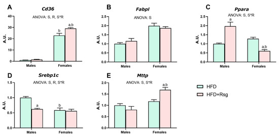 Lipid metabolism in the liver. Gene expression analysis of (A) Cd36—Cd36 antigen. (B) Mttp—microsomal triglyceride transfer protein. (C) Srebp1c—sterol regulatory element-binding protein 1. (D) Ppara—peroxisome proliferator-activated receptor alpha. (E) Fabpl—fatty acid binding protein 1, liver. Values are presented as the mean ± SEM (4–7 animals per group). Differences between sexes within groups and RSG effects were analyzed by two-way ANOVA (p < 0.05): S—sex effect; R—RSG effect; and S*R—interactive effect. Fisher’s LSD post-hoc test (p < 0.05): (a) vs. HFD rats; (b) vs. male rats.